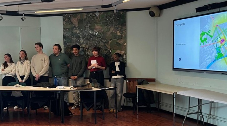 Le 10 février, les étudiants de 3ème année de la formation BUT « Carrières Sociales parcours Villes et Territoires Durables » se sont rendus à la mairie de Denain pour présenter leur projet de réaménagement du centre-ville devant le Directeur Général Adjoint des services de la mairie, Fabrice Devienne, et les responsables du Pôle Grands Projets et Résilience Territoriale, Marion Audin et Soraya Sarahoui.